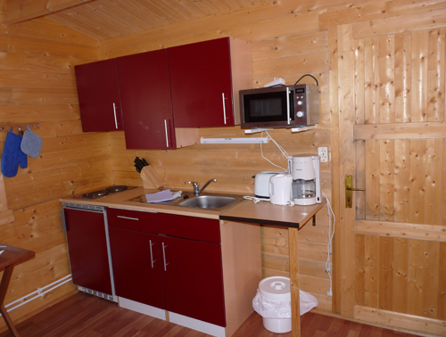 zur Küche: Wasserkocher, Kaffeemaschine, Toaster, 2 Herdplatten, Mikrowelle,